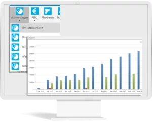 Hierbei können Umsatzvergleiche zu den Vorjahren gezogen werden, ebenso zeigt ein Umsatzverlauf (gestaffelt oder ansteigend) die Umsätze über einen beliebigen Zeitraum. Individuelle Filter und Listen bieten hier umfangreiche Auswertungsmöglichkeiten.